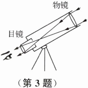 3. 某跨学科实践小组同学通过纯手工打磨镜片自制了望远镜,该望远镜不仅可以看到8亿公里外的木星,甚至能清晰地看到木星表面的斑纹,如图所示是该望远镜内部结构及光路示意图。下列关于该自制望远镜的说法正确的是(