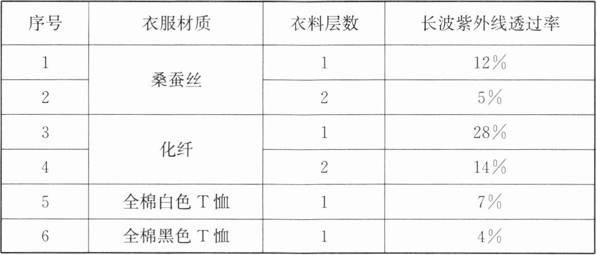 |序号|衣服材质|衣料层数|长波紫外线透过率|