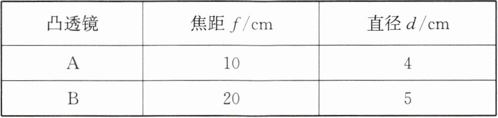 |凸透镜|焦距 $ f / cm $|直径 $ d / cm $|