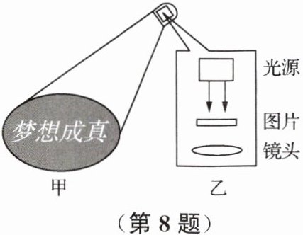 8. 如图甲所示是公共场所的宣传投影灯,装在高处的投影灯照在地面上出现图案,其内部结构如图乙所示。下列说法错误的是(