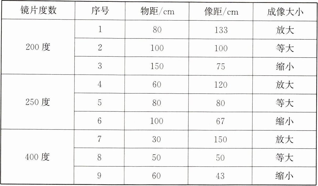 |镜片度数|序号|物距/cm|像距/cm|成像大小|