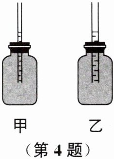 4. 在进行实践活动展示时,两位同学都带来了自制的温度计,如图所示。他们所用的玻璃小瓶相同,里面装满同种带颜色的水,在小瓶口上各插进一根吸管。请仔细观察甲、乙两支自制温度计的结构,你认为哪一支温度计对温度的反应更灵敏? 为什么?