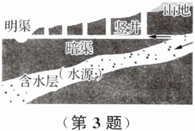 3. 吐鲁番是全国有名的“火炉”,常年高温少雨。当地流行使用坎儿井,它大大减少了输水过程中水的蒸发和渗漏。坎儿井由明渠、暗渠和竖井组成,如图所示。井内的水在夏季比外界低5~10℃。下列关于坎儿井是如何减少水的蒸发的说法,不正确的是(