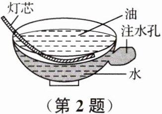 2. 据记载,唐朝时期省油灯已在四川地区出现。瓷质灯体如碗状,腹部有空夹层,可以通过注水孔向夹层装水,碗内有油和灯芯,如图所示。燃灯前,向注水孔缓慢注入冷水,让空气及时排出。燃灯时,水吸收燃料产生的热量后不断蒸发,使灯碗和灯油的温度较