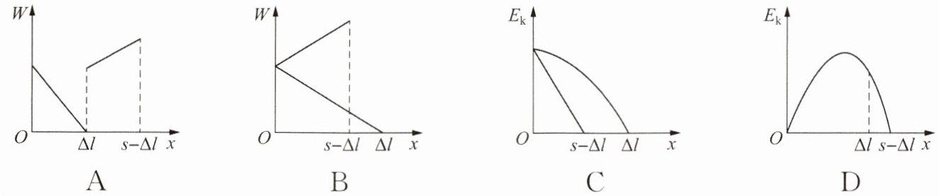 10. 如图所示,轻质弹簧左端固定,原长时右端位于 $ O $ 点,现将木块置于弹簧的右端,用力将弹簧压缩 $ \Delta l $ 的长度(弹簧始终在弹性限度内)后由静止释放,木块在水平地面上向右滑行距离为 $ s $ 后停在 $ O $ 点右侧。下列描述该过程中木块克服地面摩擦力所做的功 $ W $、木块的动能 $ E_k $ 随木块距 $ O $ 点的长度 $ x $ 变化的关系图线中,可能正确的是(