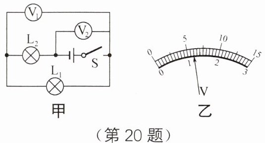 20. 小明按如图甲所示的电路进行实验,闭合开关后两灯都正常发光,两个电压表指针在表盘上所指的位置完全一样,如图乙所示,则下列说法正确的是(