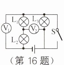 16. 如图所示电路中,电源电压 $ U_{总} $ 不变,当开关 $ S $ 断开时,电压表$\textcircled{V_1}$的示数为 $ 5 \, V $,电压表$\textcircled{V_2}$的示数为 $ 8 \, V $;当开关 $ S $ 闭合时,电压表$\textcircled{V_1}$的示数为 $ 10 \, V $,电压表$\textcircled{V_2}$的示数为 $ 6 \, V $。则电源电压 $ U_{总} $ 为