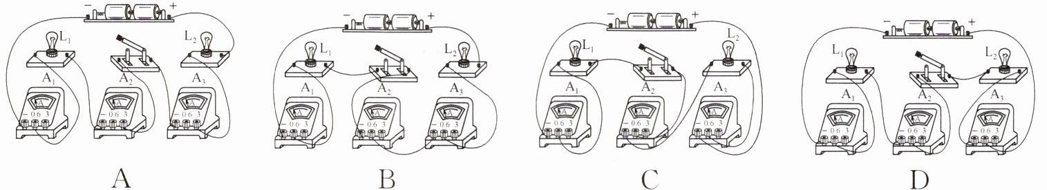 17. 在完成“探究串联电路中各处电流的关系”实验后,小明借来其他小组的电流表,同时测量三个位置的电流以验证探究结果。下列实物电路连接最合理的是(