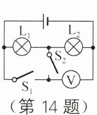 14. 如图所示,当开关 $ S_1 $、$ S_2 $ 闭合时,电压表的读数为 $ 6 \, V $,当开关 $ S_2 $ 闭合、$ S_1 $ 断开时,电压表的示数为 $ 2.4 \, V $,那么当 $ S_1 $ 和 $ S_2 $ 均断开时,小灯泡 $ L_1 $ 和 $ L_2 $ 两端的电压分别为