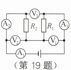 19. 某一部件外壳上三个电压表的示数分别为 $ U_1 $、$ U_2 $、$ U_3 $,三个电流表的示数分别为 $ I_1 $、$ I_2 $、$ I_3 $,它的内部结构如图所示,以下对各数据的分析正确的是(