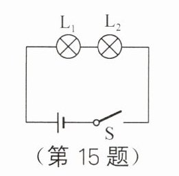 15. 小平同学用如图所示的电路研究串联电路的特点,闭合开关后,发现灯 $ L_1 $ 较亮,灯 $ L_2 $ 较暗。他对这一现象的解释是电流从电源正极出发,经过灯 $ L_1 $、灯 $ L_2 $,电流逐渐变小,所以灯 $ L_1 $ 较亮,灯 $ L_2 $ 较暗。而小漾认为小平的解释是错误的,小漾接下来的操作: