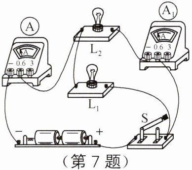 7. 如图所示的电路中,闭合开关后,电流表$A_1、$$A_2$的示数分别为0.5A和0.3A,则通过小灯泡$L_1$的电流为(