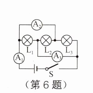 6. 如图所示,当开关S闭合时,电流表$A_1$的示数是4A,电流表$A_2$的示数是1.5A,电流表$A_3$的示数是3.5A,则通过灯$L_1$的电流是