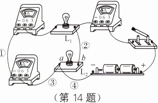 14. 小明用三个电流表和两个灯泡做实验,检验并联电路中干路电流是否等于各支路电流之和。连接的电路图如图所示,其中一根线接错了,错误的是线______(选填“①”“②”“③”或“④”);更正之后开始实验:两灯都发光,经过灯$L_2$的电流方向是______(选填“a→b”或“b→a”);实验中$L_1$灯丝突然断了不发光,则$L_2______($选填“能”或“不能”)发光。
