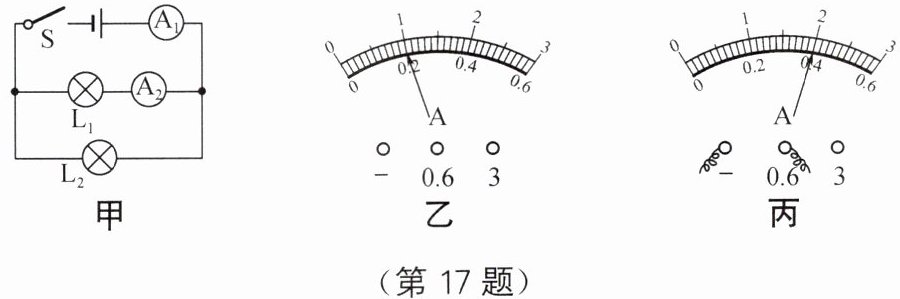 17. 如图甲所示的电路图,电源电压恒为2.8V,开关闭合时,两灯都亮,两个电流表的示数分别如图乙和图丙,判断$A_1$表(图乙)的示数是
