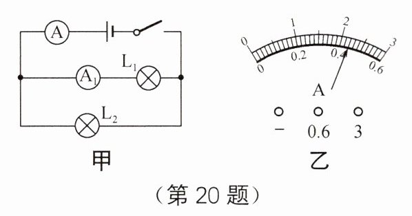 20. 如图甲所示,开关闭合后,两个电流表指针偏转均如图乙所示,则通过$L_1$和$L_2$的电流分别为(