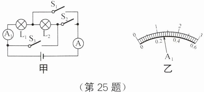 (3)当开关$S_1$和$S_3$闭合$,S_2$断开时,若电流表A的示数为0.6A,电流表$A_1$的示数如图乙,则过$L_1$和$L_2$的电流分别是多少?