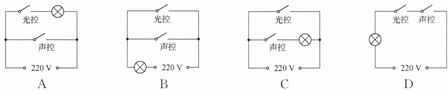 9. 某同学设计一个楼道照明“智能化”电路,即利用“光控开关”(天黑时自动闭合,天亮时自动断开)和“声控开关”(当有人走过发出声音时,自动闭合,无人走过没有声音时,自动断开)来控制灯泡。下列符合要求的电路图是(