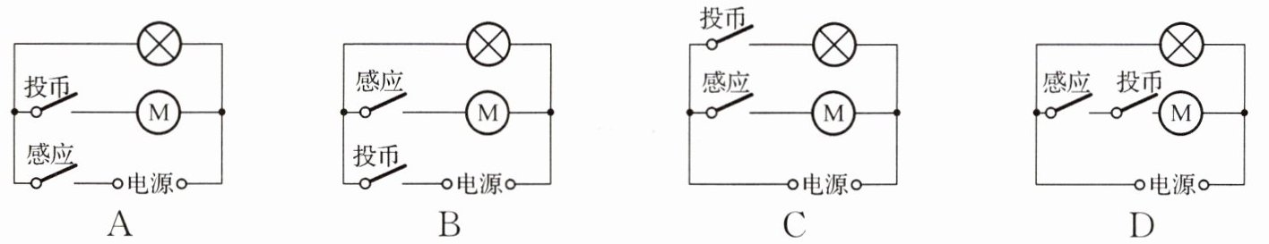 10. 某款“抓娃娃”机通过投币接通电源后,娃娃机内彩灯发光,接着用手接触“感应”开关接通电动机才能抓取“娃娃”,不投币只用手接触“感应”开关无法抓“娃娃”。下列简化电路中符合要求的是(