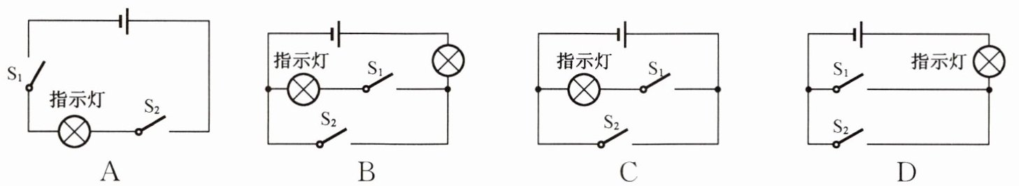 11. 为保证司乘人员的安全,轿车上设有安全带未系提示系统。当乘客坐在座椅上时,座椅下的开关 $ S_1 $ 闭合,若未系安全带,则开关 $ S_2 $ 断开,仪表上的指示灯亮起;若系上安全带,则开关 $ S_2 $ 闭合,指示灯熄灭。下列电路设计比较合理的是(