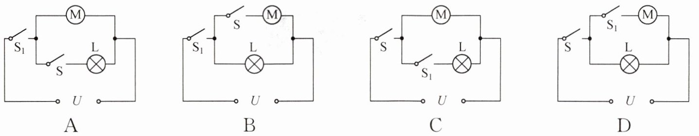 12. 使用电风扇时,有时候因为忘记断开风扇开关 $ S $ 而浪费能源。小宁在父母指导下对风扇电路进行了改装:加装一个红外感应开关 $ S_1 $ 和指示灯 $ L $。加装后,若 $ S $ 断开,指示灯和风扇都不工作;当 $ S $ 闭合时,$ L $ 工作,此时当红外感应装置感应到有人时,$ S_1 $ 才闭合,风扇工作。小宁设计的电路图可能是(