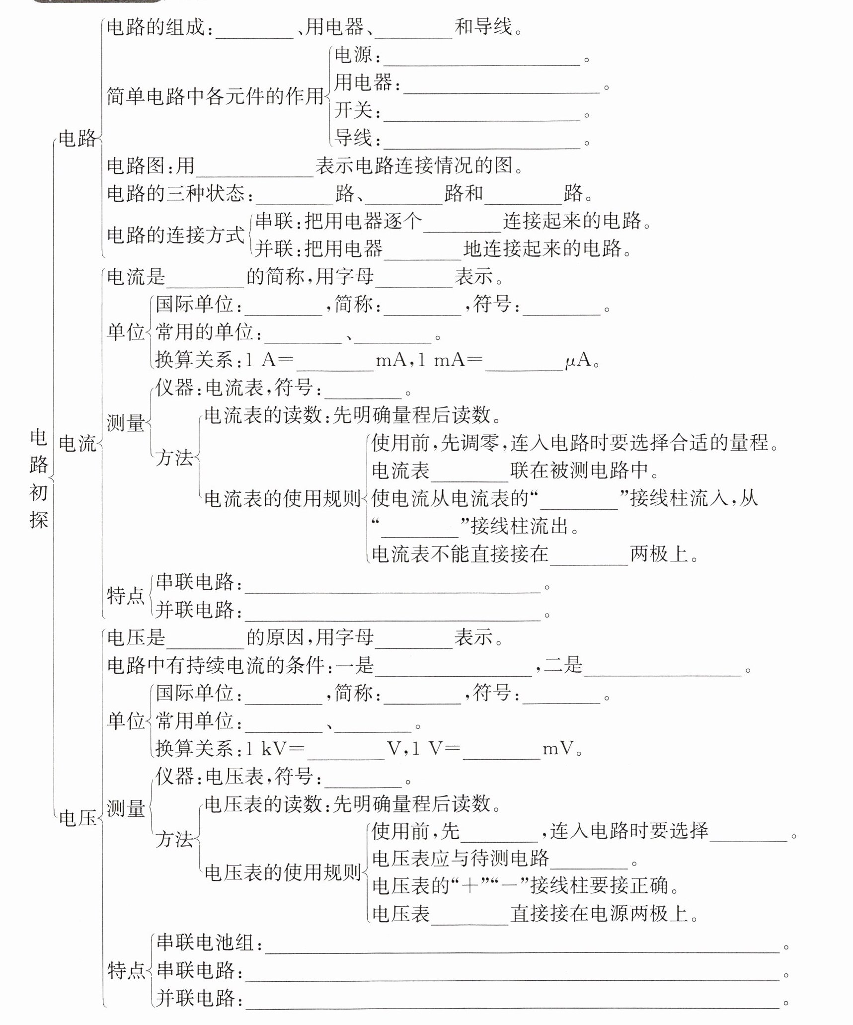 电源 开关 持续供电 利用电能进行工作 控制电路的通断 连接电路 电路元件符号 通 断 短 顺次 并列 电流强度 I 安培 安 A mA μA $10^3$ $10^3$ Ⓐ 串 + - 电源 电流处处相等 干路中的电流等于各支路中的电流之和 形成电流 U 有电源提供电压 电路是闭合回路 伏特 伏 V kV mV $10^3$ $10^3$ Ⓥ 调零 合适的量程 并联 能 串联电池组的电压等于每节电池的电压之和 电路两端的总电压等于各部分电路两端的电压之和 电路两端的总电压等于各支路两端的电压