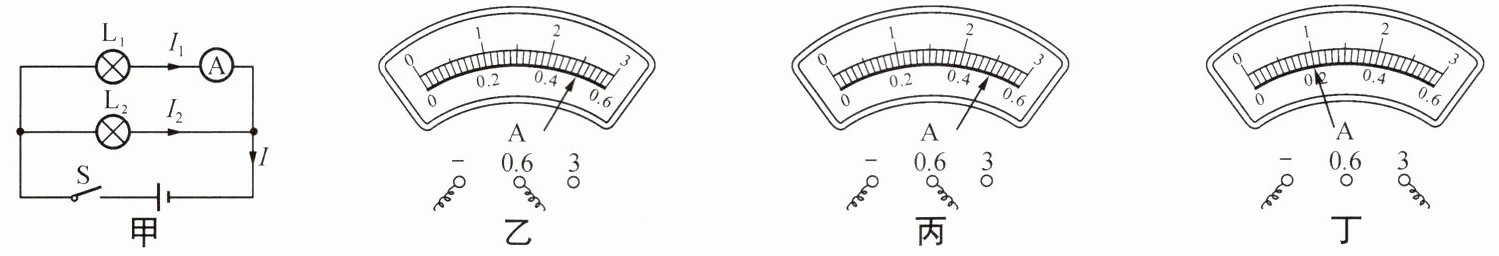 。(3)排除故障后,她测出了$L_{1}$、$L_{2}支路和干路上的电流分别为I_{1}$、$I_{2}和I$,电流表示数如图乙、图丙、图丁所示,可读出:$I_{1}= 0.5\ A$,$I_{2}= $