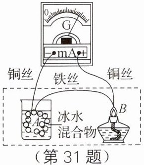 31. 将两种不同的导体互相焊接成闭合回路,当两个接点温度不同时,回路中就会产生电流,这种电流叫“热电流”,这种电路叫“热电偶电路”。为了验证这个说法,小红设计了如图所示的电路进行探究。