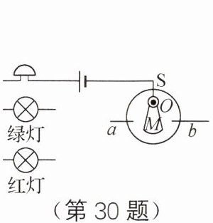 30. 某船上装有平衡警示电路,其中$S$为重力开关,金属片$M可绕O$点自由转动。当船水平时,$M在a$、$b$中间;当船左倾到一定程度时,绿灯亮、电铃响;当船右倾到一定程度时,红灯亮、电铃响。请完成电路图。