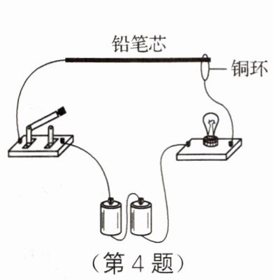 4. 如图所示,某同学用铅笔芯设计了一个简易调光灯电路。闭合开关,将铜环向左移动的过程中灯泡亮度会