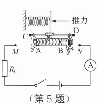 5. 如图所示是测量推力大小的部分电路,要求推力越大电流表示数越大,则电路中M、N两点应分别接滑动变阻器的
