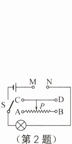 2. 如图所示,若要使滑动变阻器的滑片P向左端滑动时,小灯泡变亮,那么可以将滑动变阻器的C接线柱与
