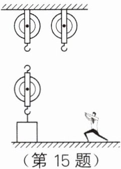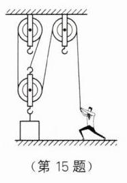 15. 如图所示,某工人站在地面上使用由三个滑轮组成的滑轮组提升重物,请用笔画线代替绳子,画出最省力的绕绳方法。