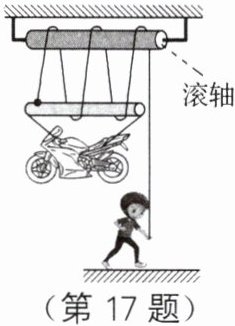 17. 小明利用两根滚轴和绳子组装了如图所示的装置。借助该装置,小明用向下的拉力在$20s内就将质量为70kg的摩托车匀速提升3m$。$g取10N/kg$。