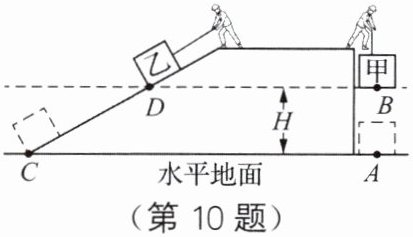 10. 如图所示,把重为 $ G $ 的物体甲从 $ A $ 点竖直向上匀速拉至 $ B $ 点的过程中,绳的拉力对甲做的功为 $ W_{AB} $;用平行于斜面的拉力把重也为 $ G $ 的物体乙沿斜面从 $ C $ 点匀速拉至与 $ B $ 等高的 $ D $ 点,在此过程中的拉力对乙做的功为 $ W_{CD} $,斜面的机械效率为(