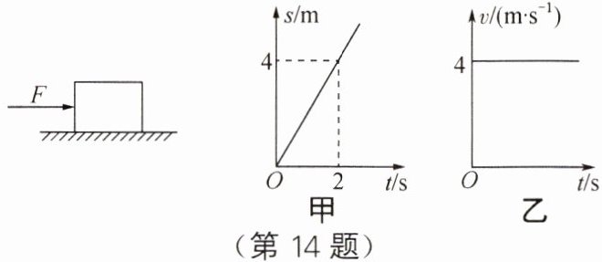 14. 物体在水平地面上做直线运动,当物体运动的路程和时间图像如图甲所示时,受到的水平推力为$F_{1}$。当物体运动的速度和时间图像如图乙所示时,受到的水平推力为$F_{2}$。两次推力的功率分别为$P_{1}$、$P_{2}$。则下列关系正确的是(