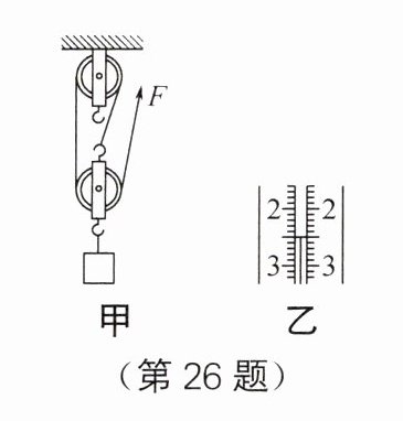 26. (5 分)用图甲所示滑轮组做“探究动滑轮的重对滑轮组机械效率的影响”实验。把不同的磁铁吸附在动滑轮边框上以改变滑轮的重,匀速拉动绳子使物体每次上升距离均为 $ 10 \, cm $,不计绳重,实验数据如下表所示。