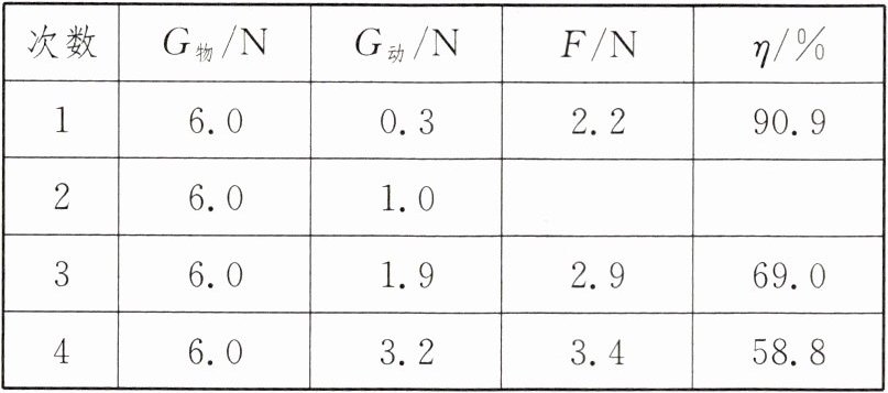 (选填“变大”“变小”或“不变”)。| 次数 | $ G_{物} / N $ | $ G_{动} / N $ | $ F / N $ | $ \eta / \% $ |