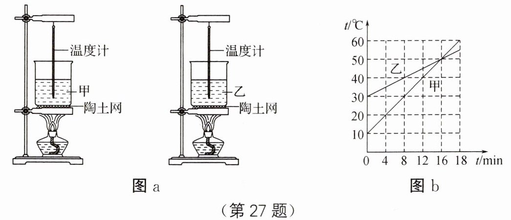 27. (8 分)小明利用图 a 所示实验装置“探究不同物质吸热升温的现象”,其操作如下: