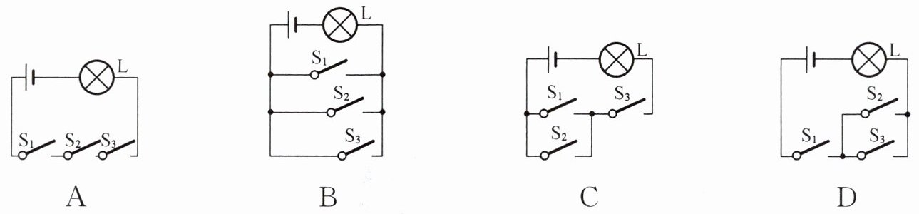 6. 小明在学习了电路知识之后,设计了一个手机解锁电路,分别用 $ S_1 $ 代替“密码解锁”,$ S_2 $ 代替“指纹解锁”,$ S_3 $ 代替“人脸解锁”,小灯泡 $ L $ 代替手机屏幕。这三种方式中使用任意一种就能解锁手机屏幕。如图所示的电路图中能实现上述功能的是(