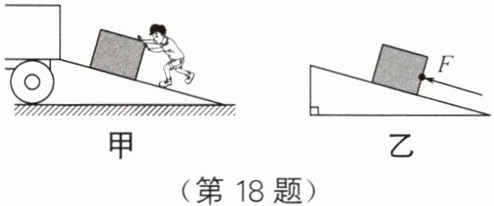 18. 斜面是一种简单机械,在我国战国时期,墨子所作的《墨经》一书中就记载了利用斜面来提升重物的方法。在日常生活中经常会使用斜面,例如卡车装载大型货物时,常会在车尾斜搭一块木板,工人将货物沿木板推人车厢,如图甲所示。将这一情景简化为图乙所示,斜面长$s = 5m$,高$h = 2m$。用平行于斜面$F = 500N$的推力,将重力为1000N的物体,由斜面的底端匀速推到顶端,所用时间$t = 10s$。求:
