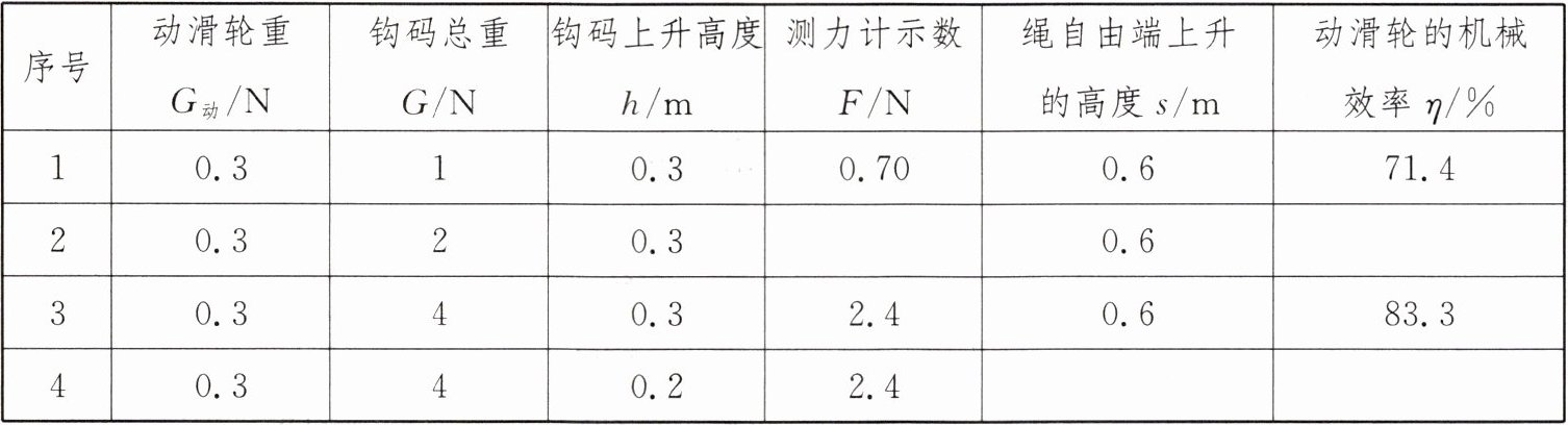 |序号|动滑轮重$G_{动}/N$|钩码总重$G/N$|钩码上升高度$h/m$|测力计示数$F/N$|绳自由端上升的高度$s/m$|动滑轮的机械效率$\eta/\%$|