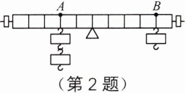 2. 如图所示,每个钩码的质量为50g,在均匀杠杆的A处挂2个钩码,B处挂1个钩码,杠杆恰好水平平衡。在A、B两处再各加1个钩码,那么(