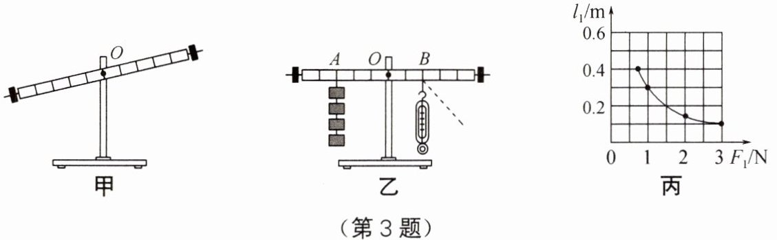 (选填“变大”“变小”或“不变”)。(4)保持A点钩码数量和力臂不变,杠杆在水平位置平衡时,测出多组动力臂$ l_{1} $和动力 $ F_{1} $的数据,绘制了$ l_{1}-F_{1} $的关系图像,如图丙所示。请根据图像推算,当$ F_{1}= 2N $时,$ l_{1}= $