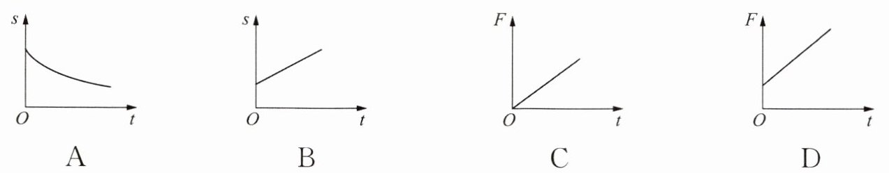 10. 如图所示,小车从处于轻质杠杆 OB 的 A 点开始匀速向右运动,在 B 端竖直向上方向系一根不可伸缩的细绳使杠杆始终处于水平位置平衡。下列表示小车与 B 端的距离 s 和细绳的拉力 F 随时间 t 变化的关系图像中,可能正确的是(