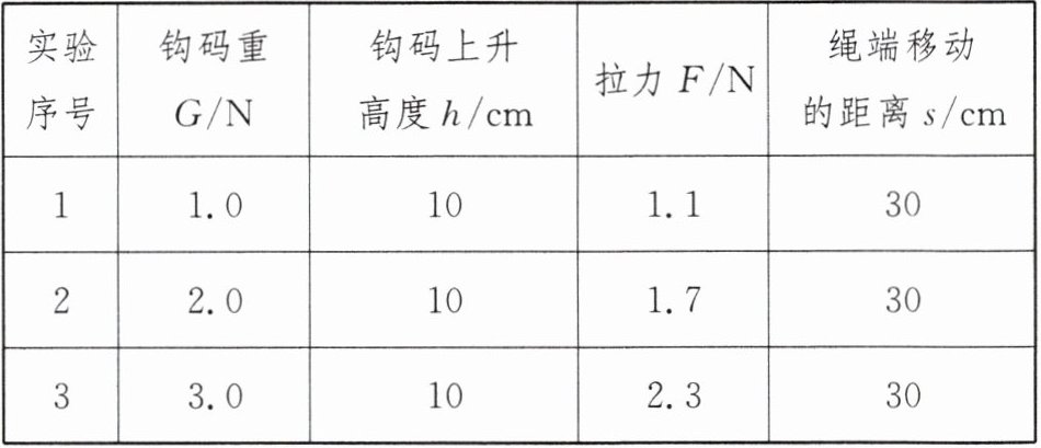 |实验序号|钩码重$G/N$|钩码上升高度$h/cm$|拉力$F/N$|绳端移动的距离$s/cm$|