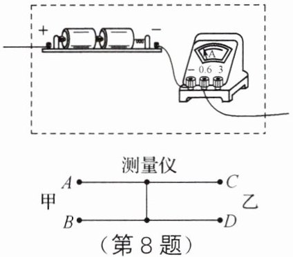 8. 甲、乙两地相距 40 km,在甲、乙两地之间沿直线架设了两条输电线,已知输电线的电阻与其长度成正比,现输电线在某处发生了短路,为确定短路位置,甲地检修员先用如图所示的测量仪接入 AB 时,电流表的示数为 0.3 A,乙地检修员后用相同的测量仪接入 CD 时,电流表的示数为 0.5 A。则短路位置离甲地(