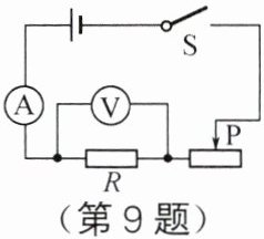 9. 用如图所示的电路探究通过导体的电流与电阻的关系。器材有:干电池 2 节(每节 1.5 V,串联使用),开关、滑动变阻器(20 Ω 2 A)、电压表、电流表各一个,阻值为 5 Ω、10 Ω、15 Ω、20 Ω 的定值电阻各一个,导线若干。连接好电路,设定加在电阻两端的电压为 1.2 V 进行探究,发现在获得两组数据后无法再进行实验,为了继续使用前面两组数据,利用现有器材完成探究,下列方案中可行的是(
