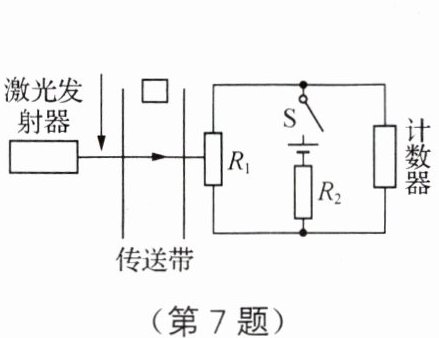 7. 某科技小组为快递公司设计的分拣计数装置简化电路如图所示。$ R_{2} $ 为定值电阻,$ R_{1} $ 为光敏电阻,当有光照射光敏电阻时其阻值变小。激光被遮挡一次,计数器会自动计数一次(计数器可视为电压表)。闭合开关,激光被遮挡瞬间,下列说法正确的是(