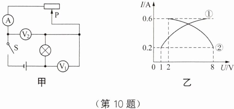 10. 如图甲所示的电路中,闭合开关 S,将滑动变阻器的滑片从最右端滑至灯泡正常发光的位置,电流表示数与两电压表示数的变化关系图像如图乙所示。则下列选项中正确的是(